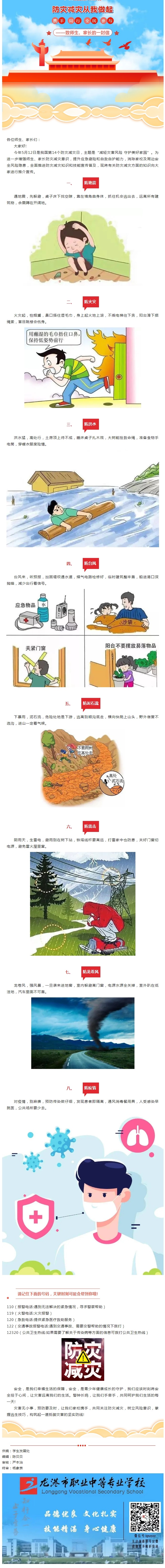今年5月12日是我国第14个防灾减灾日,主题是“减轻灾害风险 守护美好家园”。为进一步增强师生、家长防灾减灾意识,提升应急避险和自救自护能力,消除家校及周边安全风险隐患,全面推进防灾减灾知识和技能宣传普及,现将有关防灾减灾方面的知识向大家进行推介宣传。