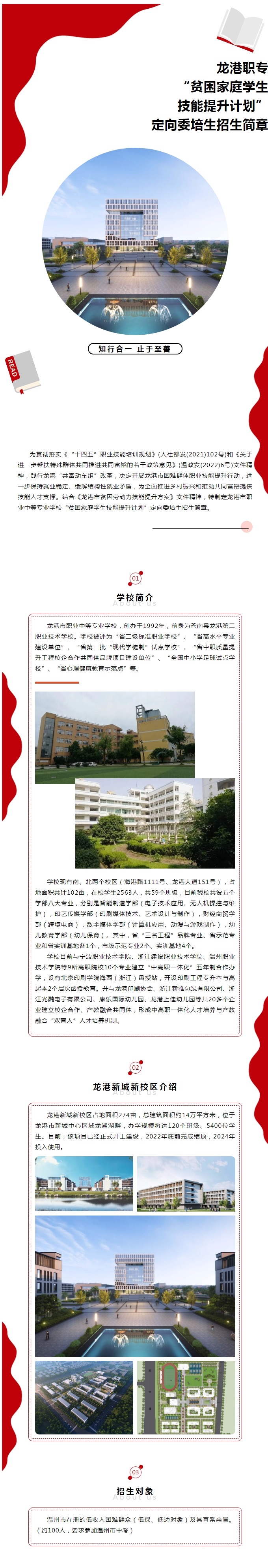 为贯彻落实《“十四五”职业技能培训规划》(人社部发(2021)102号)和《关于进一步帮扶特殊群体共同推进共同富裕的若干政策意见》(温政发(2022)6号)文件精神,践行龙港“共富动车组”改革,决定开展龙港市困难群体职业技能提升行动,进一步保持就业稳定、缓解结构性就业矛盾,为全面推进乡村振兴和推动共同富裕提供技能人才支撑。结合《龙港市贫困劳动力技能提升方案》文件精神,特制定龙港市职业中等专业学校“贫困家庭学生技能提升计划”定向委培生招生简章。