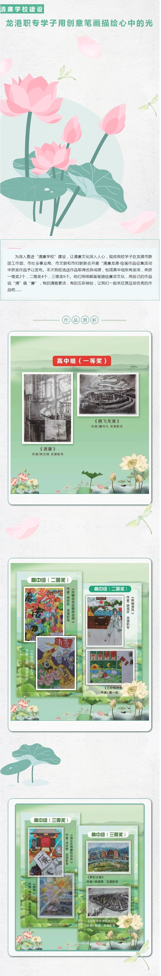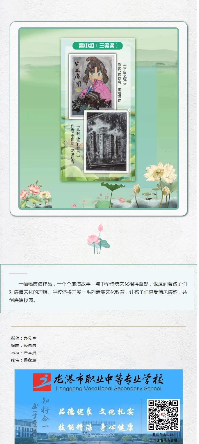 为深入推进“清廉学校”建设,让清廉文化深入人心,现将我校学子在龙港市群团工作部、市社会事业局、市文联和市妇联联合开展“清廉龙港·绘画作品征集活动中获奖作品予以发布。本次我校选送作品取得优异成绩,包揽高中组所有奖项,荣获一等奖2个,二等奖4个,三等奖6个。他们用细腻画笔描绘廉洁文化,用自己的作品说“清”倡“廉”,有的清雅素洁,有的五彩缤纷,让我们一起来欣赏这些优秀的作品吧......