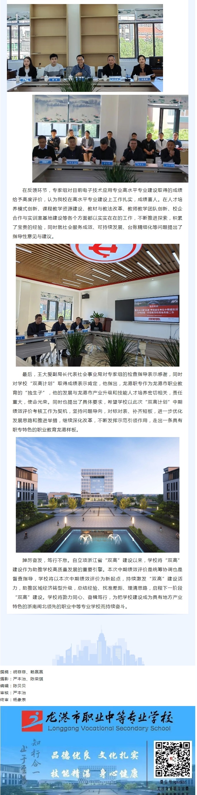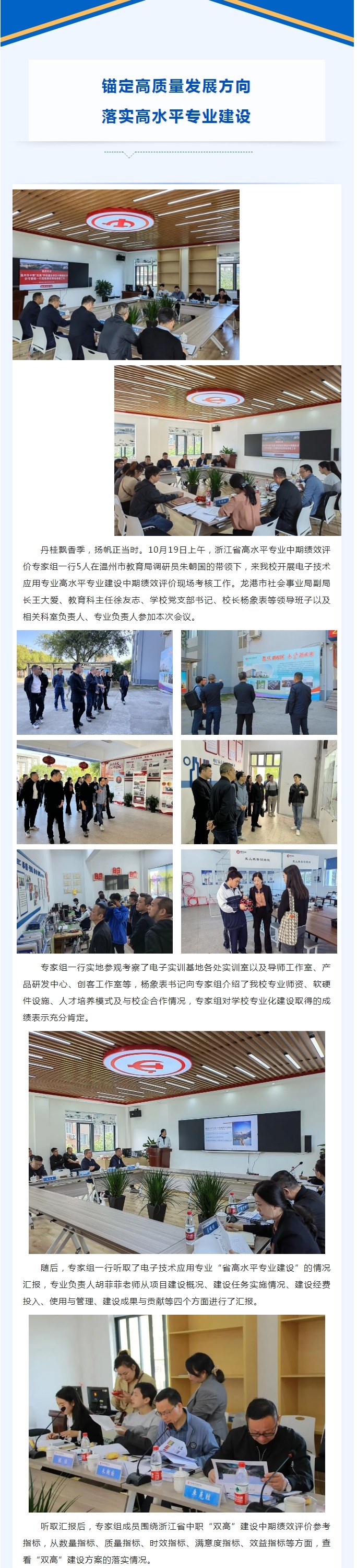 丹桂飘香季,扬帆正当时。10月19日上午,浙江省高水平专业中期绩效评价专家组一行5人在温州市教育局调研员朱朝国的带领下,来我校开展电子技术应用专业高水平专业建设中期绩效评价现场考核工作。龙港市社会事业局副局长王大爱、教育科主任徐友志、学校党支部书记、校长杨象表等领导班子以及相关科室负责人、专业负责人参加本次会议。
