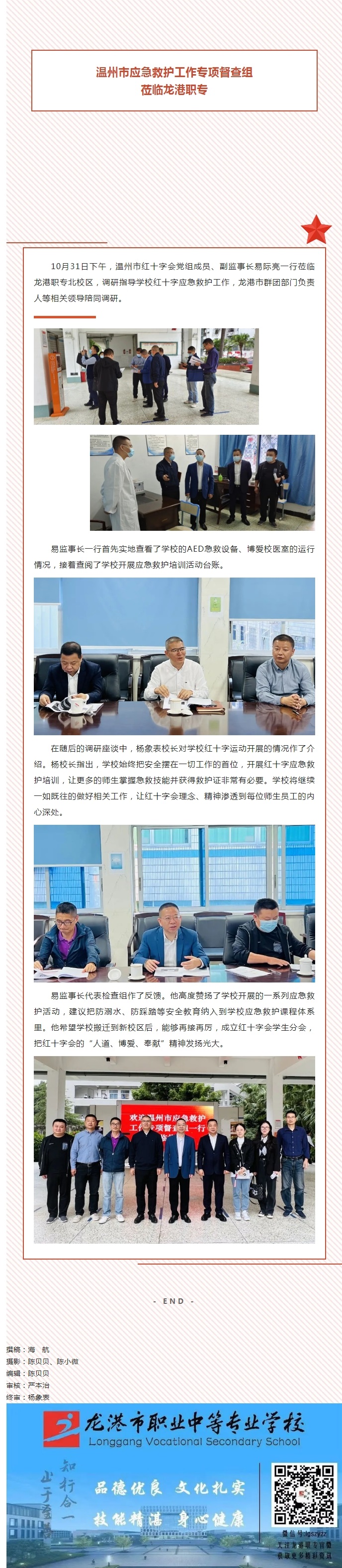 10月31日下午,温州市红十字会党组成员、副监事长易际亮一行莅临龙港职专北校区,调研指导学校红十字应急救护工作,龙港市群团部门负责人等相关领导陪同调研。