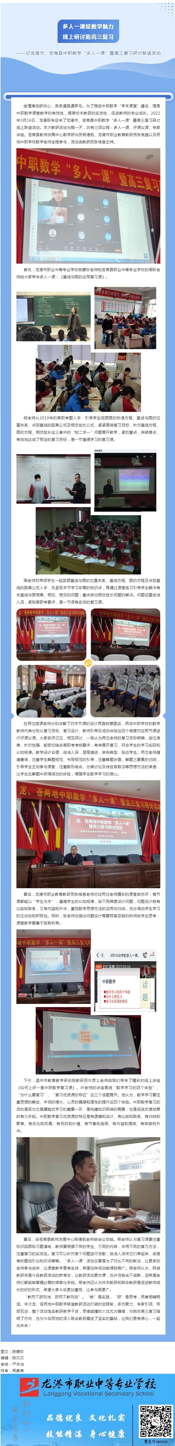 疫情难挡研究心,条条道路通罗马。为了推进中职数学“学本课堂”建设,提高中职数学课堂教学的有效性,提高校本教研的实效性,促进教师的专业成长。2022年3月16日,龙港职专迎来了龙港市、苍南县中职数学“多人一课”暨高三复习研讨线上联谊活动。本次教研活动为期一天,共有三项议程:多人一课、评课议课、专家讲座。苍南县教师发展中心数学研训员杨德凯、龙港市职业教育教研员张培恳以及两地中职学校数学老师全程参与,活动由教研员张培恳主持。