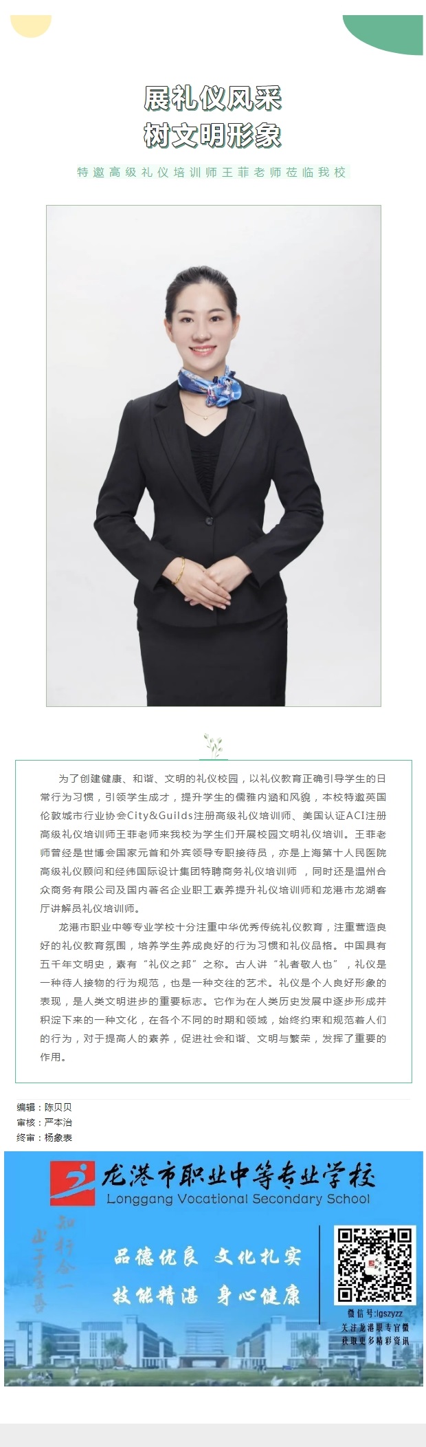 为了创建健康、和谐、文明的礼仪校园,以礼仪教育正确引导学生的日常行为习惯,引领学生成才,提升学生的儒雅内涵和风貌,本校特邀英国伦敦城市行业协会City&Guilds注册高级礼仪培训师、美国认证ACI注册高级礼仪培训师王菲老师来我校为学生们开展校园文明礼仪培训。王菲老师曾经是世博会国家元首和外宾领导专职接待员,亦是上海第十人民医院高级礼仪顾问和经纬国际设计集团特聘商务礼仪培训师 ,同时还是温州合众商务有限公司及国内著名企业职工素养提升礼仪培训师和龙港市龙湖客厅讲解员礼仪培训师。