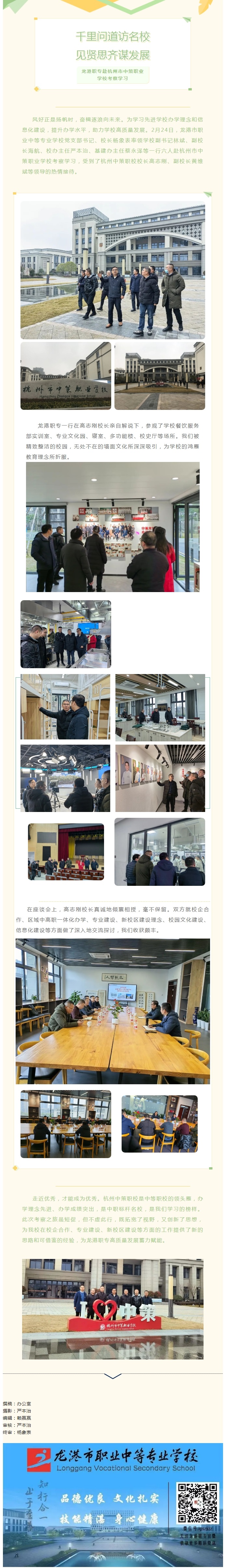 风好正是扬帆时,奋楫逐浪向未来。为学习先进学校办学理念和信息化建设,提升办学水平,助力学校高质量发展。2月24日,龙港市职业中等专业学校党支部书记、校长杨象表率领学校副书记林斌、副校长海航、校办主任严本治、基建办主任蔡永泽等一行六人赴杭州市中策职业学校考察学习,受到了杭州中策职校校长高志刚、副校长黄维斌等领导的热情接待。