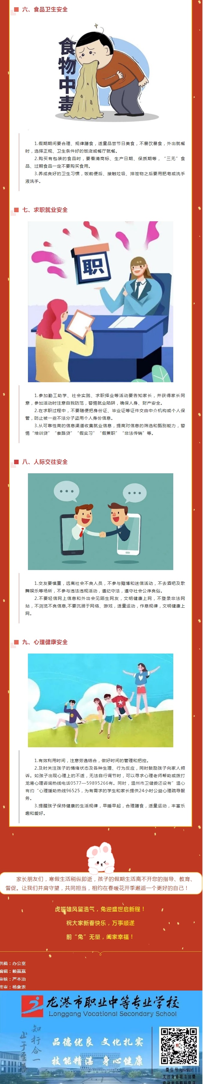 虎辞旧岁,兔跃新程。我们携手走过了不平凡的2022年,共同见证了孩子的成长和进步,一起收获了岁月的幸福与美好。值此新春佳节来临之际,龙港职专全体教职员工对这一年来大力支持和关心学校发展与学生成长的家长朋友们表示衷心的感谢!为了让孩子度过一个安全、健康、愉快且有意义的假期,根据市教育局文件精神,结合本校实际情况,现将学校放假安排及注意事项通知如下: