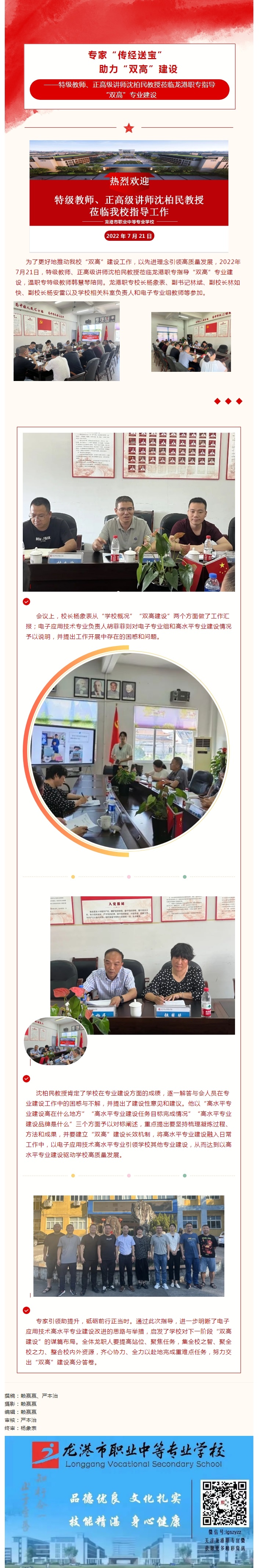 为了更好地推动我校“双高”建设工作,以先进理念引领高质量发展,2022年7月21日,特级教师、正高级讲师沈柏民教授莅临龙港职专指导“双高”专业建设,温职专特级教师韩慧琴陪同。龙港职专校长杨象表、副书记林斌、副校长林如快、副校长杨安雷以及学校相关科室负责人和电子专业组教师等参加。