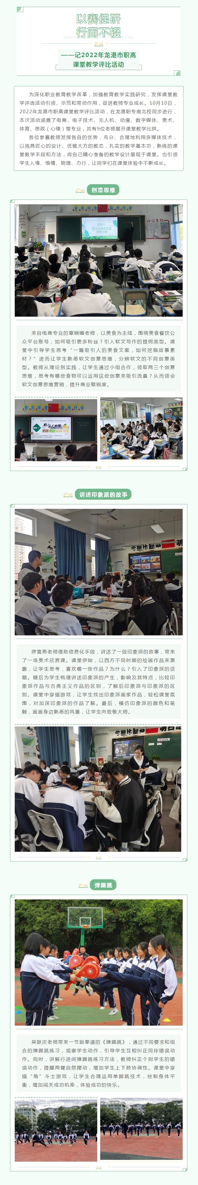 为深化职业教育教学改革,加强教育教学实践研究,发挥课堂教学评选活动引领、示范和带动作用,促进教师专业成长。10月10日,2022年龙港市职高课堂教学评比活动,在龙港职专南北校同步进行,本次活动涵盖了电商、电子技术、无人机、动漫、数字媒体、美术、体育、思政(心理)等专业,共有9位老师展开课堂教学比拼。
