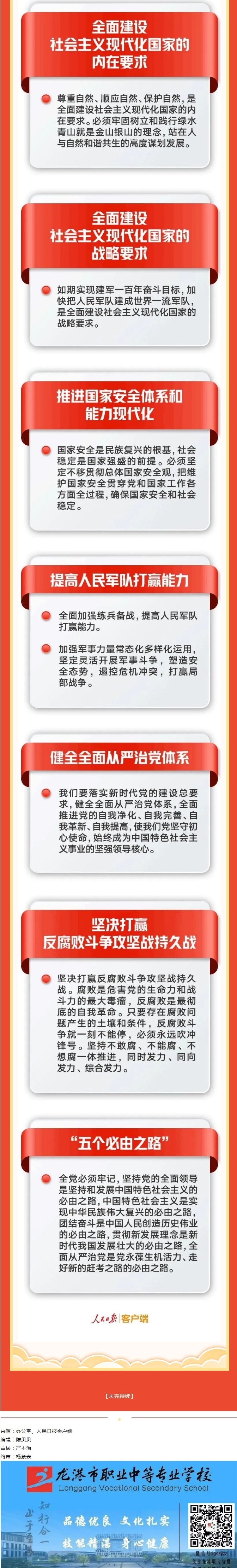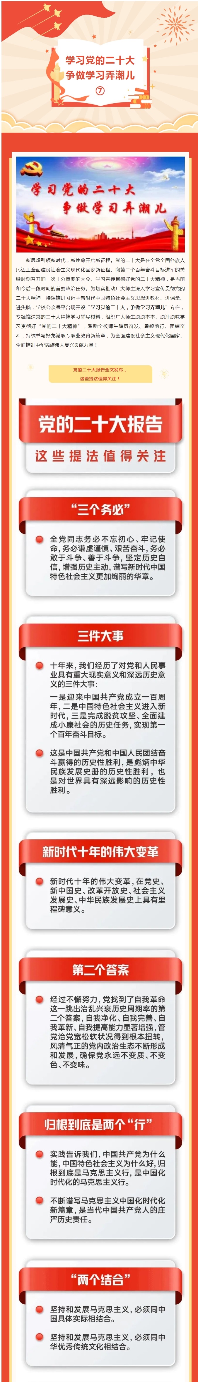 新思想引领新时代,新使命开启新征程。党的二十大是在全党全国各族人民迈上全面建设社会主义现代化国家新征程、向第二个百年奋斗目标进军的关键时刻召开的一次十分重要的大会。学习宣传贯彻好党的二十大精神,是当前和今后一段时期的首要政治任务。为切实推动广大师生深入学习宣传贯彻党的二十大精神,持续推进习近平新时代中国特色社会主义思想进教材、进课堂、进头脑,学校公众号平台现开设“学习党的二十大,争做学习弄潮儿”专栏,专题推送党的二十大精神学习辅导材料,组织广大师生原原本本、原汁原味学习贯彻好“党的二十大精神”,激励全校师生踔厉奋发、勇毅前行、团结奋斗,持续书写好龙港职专职业教育新篇章,为全面建设社会主义现代化国家、全面推进中华民族伟大复兴贡献力量!