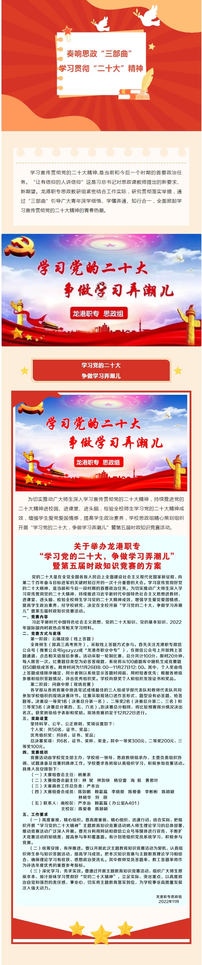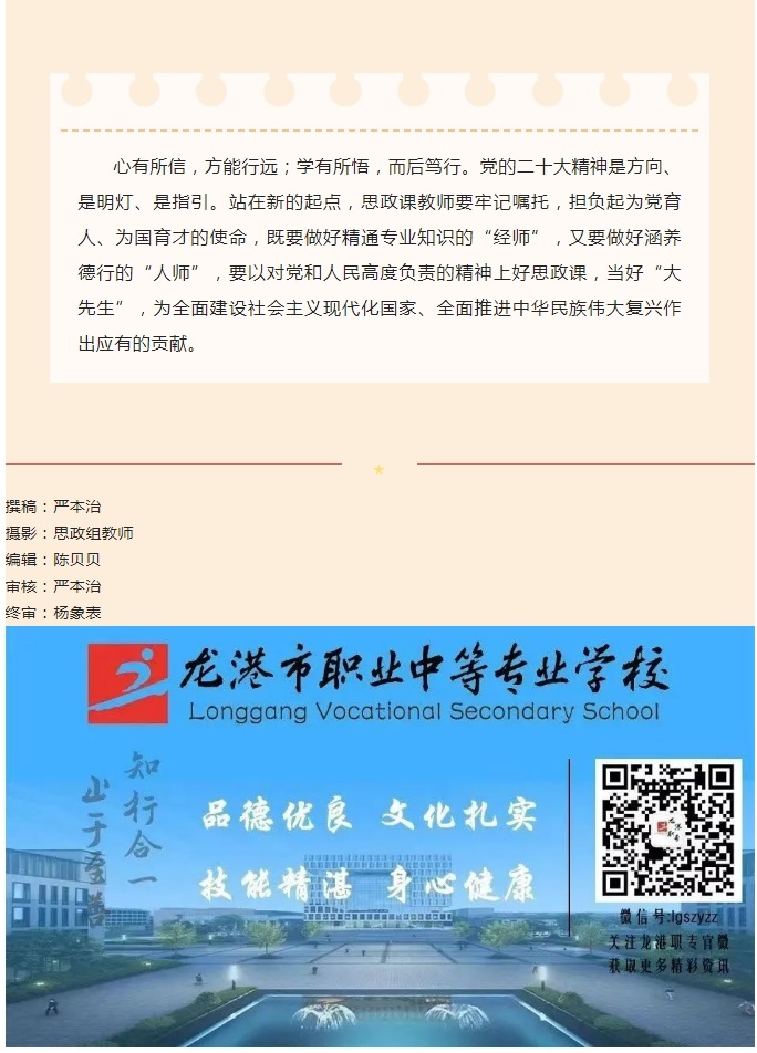 学习宣传贯彻党的二十大精神,是当前和今后一个时期的首要政治任务。“让有信仰的人讲信仰”这是习总书记对思政课教师提出的新要求、新期望。龙港职专思政教研组紧密结合工作实际,研究贯彻落实举措,通过“三部曲”引导广大青年深学细悟、学懂弄通、知行合一,全面掀起学习宣传贯彻党的二十大精神的青春热潮。