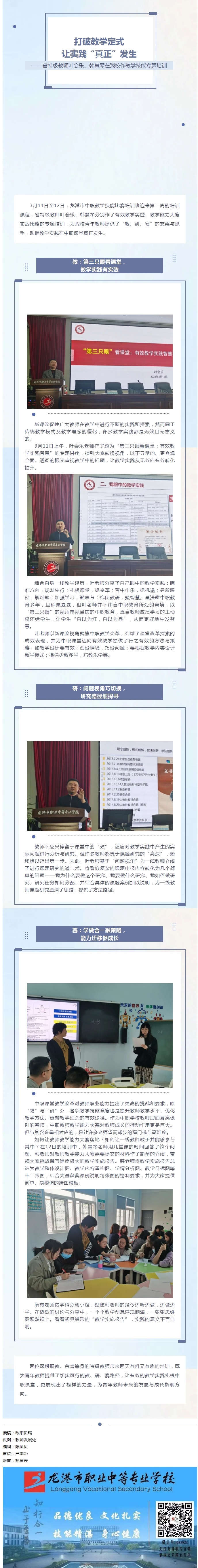 3月11日至12日,龙港市中职教学技能比赛培训班迎来第二周的培训课程,省特级教师叶会乐、韩慧琴分别作了有效教学实践、教学能力大赛实战策略的专题培训,为我校青年教师提供了“教、研、赛”的支架与抓手,助推教学实践在中职课堂真正发生。