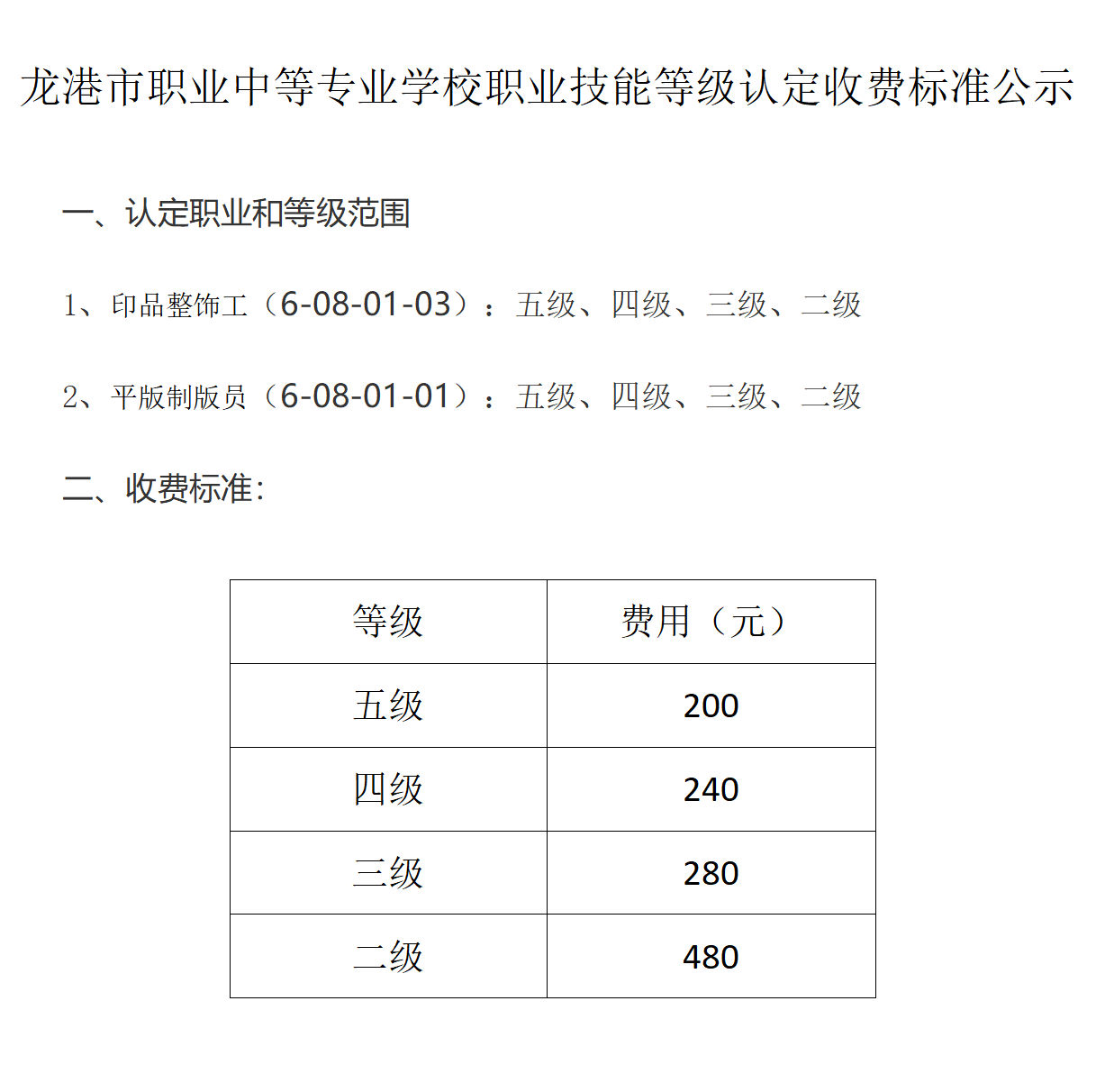 龙港市职业中等专业学校职业技能等级认定收费标准公示