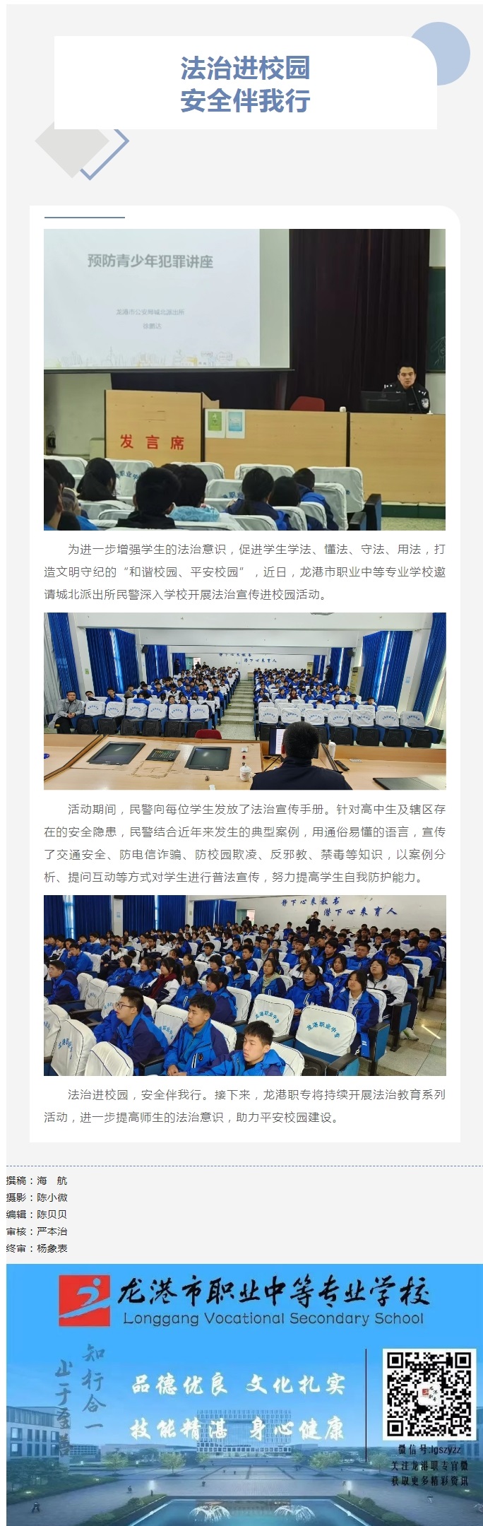 为进一步增强学生的法治意识,促进学生学法、懂法、守法、用法,打造文明守纪的“和谐校园、平安校园”,近日,龙港市职业中等专业学校邀请城北派出所民警深入学校开展法治宣传进校园活动。
