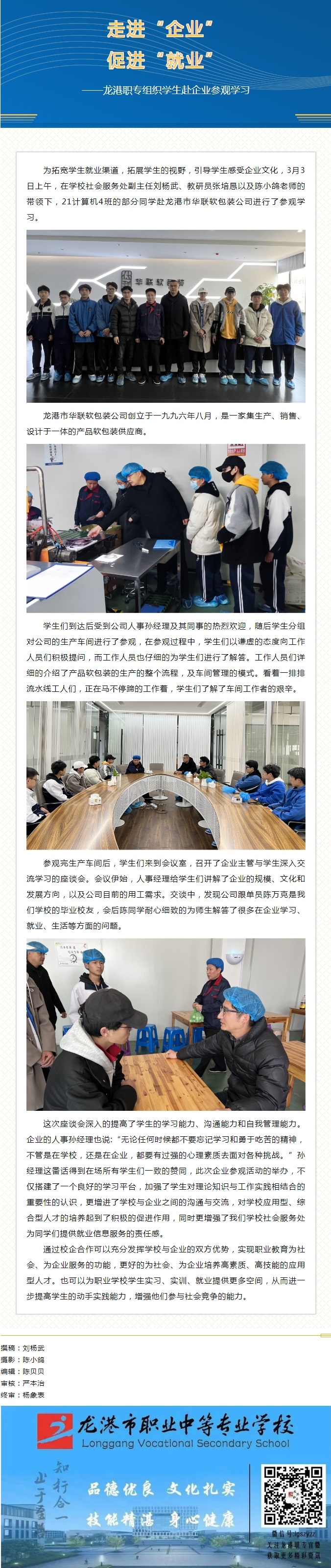 为拓宽学生就业渠道,拓展学生的视野,引导学生感受企业文化,3月3日上午,在学校社会服务处副主任刘杨武、教研员张培恳以及陈小鸽老师的带领下,21计算机4班的部分同学赴龙港市华联软包装公司进行了参观学习。