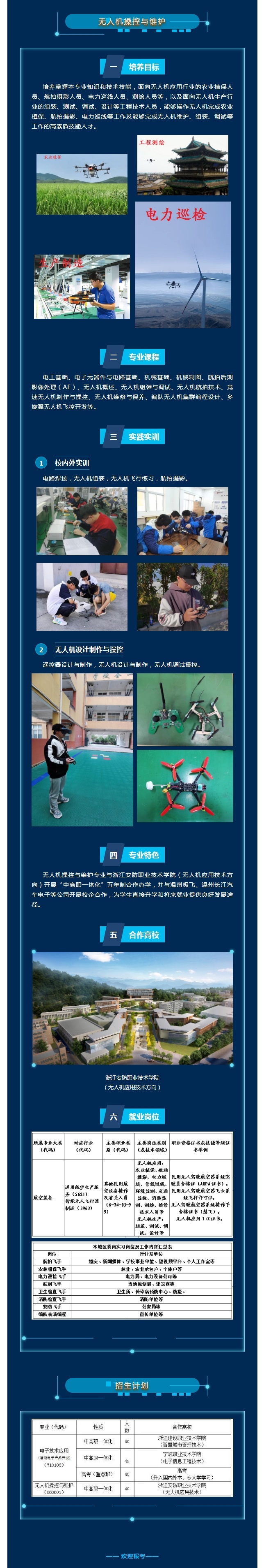 培养掌握本专业知识和技术技能,面向无人机应用行业的农业植保人员、航拍摄影人员、电力巡线人员、测绘人员等,以及面向无人机生产行业的组装、测试、调试、设计等工程技术人员,能够操作无人机完成农业植保、航拍摄影、电力巡线等工作及能够完成无人机维护、组装、调试等工作的高素质技能人才。