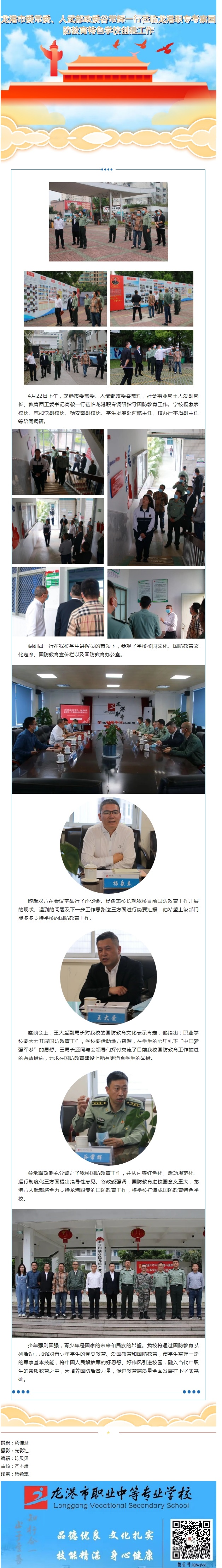 4月22日下午,龙港市委常委、人武部政委谷常辉,社会事业局王大爱副局长、教育团工委书记高毅一行莅临龙港职专调研指导国防教育工作。学校杨象表校长、林如快副校长、杨安雷副校长、学生发展处海航主任、校办严本治副主任等陪同调研。