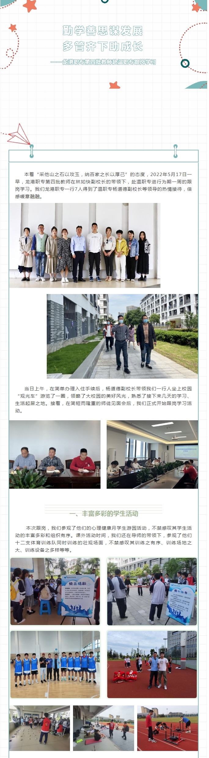 本着“采他山之石以攻玉,纳百家之长以厚己”的态度,2022年5月17日一早,龙港职专第四批教师在林如快副校长的带领下,赴温职专进行为期一周的跟岗学习。我们龙港职专一行7人得到了温职专杨道德副校长等领导的热情接待,倍感暖意融融。