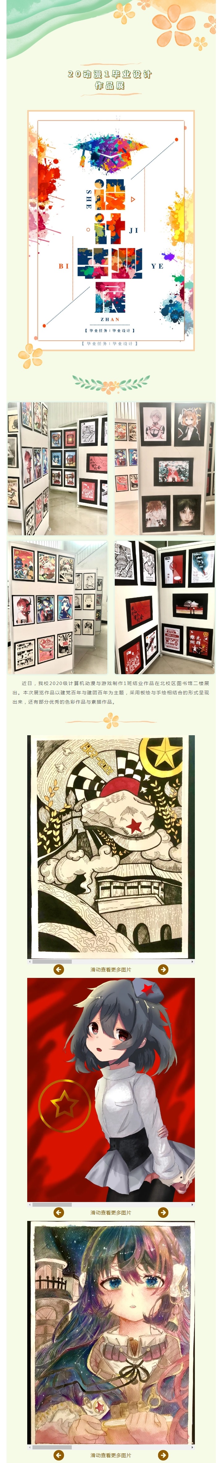 近日,我校2020级计算机动漫与游戏制作1班结业作品在北校区图书馆二楼展出。本次展览作品以建党百年与建团百年为主题,采用板绘与手绘相结合的形式呈现出来,还有部分优秀的色彩作品与素描作品。