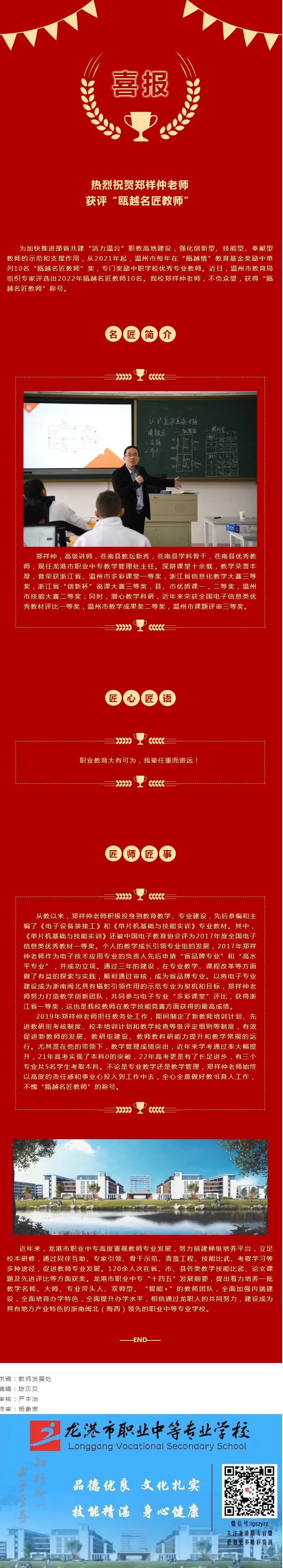 为加快推进部省共建“活力温台”职教高地建设,强化创新型、技能型、奉献型教师的示范和支撑作用,从2021年起,温州市每年在“瓯越情”教育基金奖励中单列10名“瓯越名匠教师”奖,专门奖励中职学校优秀专业教师。近日,温州市教育局组织专家评选出2022年瓯越名匠教师10名。我校郑祥仲老师,不负众望,获得“瓯越名匠教师”称号。