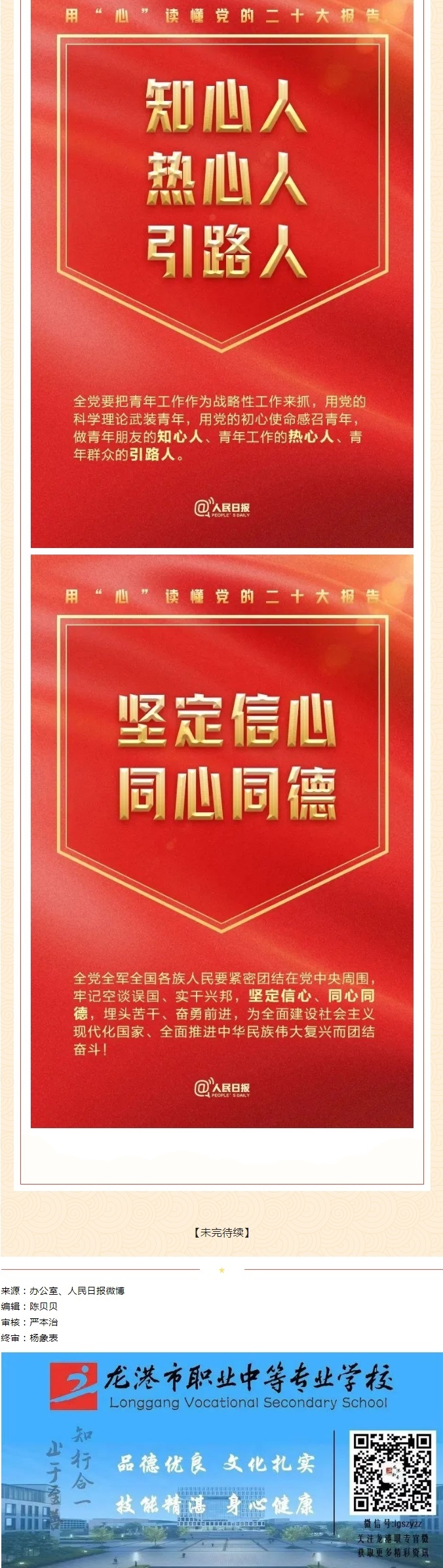新思想引领新时代,新使命开启新征程。党的二十大是在全党全国各族人民迈上全面建设社会主义现代化国家新征程、向第二个百年奋斗目标进军的关键时刻召开的一次十分重要的大会。学习宣传贯彻好党的二十大精神,是当前和今后一段时期的首要政治任务。为切实推动广大师生深入学习宣传贯彻党的二十大精神,持续推进习近平新时代中国特色社会主义思想进教材、进课堂、进头脑,学校公众号平台现开设“学习党的二十大,争做学习弄潮儿”专栏,专题推送党的二十大精神学习辅导材料,组织广大师生原原本本、原汁原味学习贯彻好“党的二十大精神”,激励全校师生踔厉奋发、勇毅前行、团结奋斗,持续书写好龙港职专职业教育新篇章,为全面建设社会主义现代化国家、全面推进中华民族伟大复兴贡献力量!