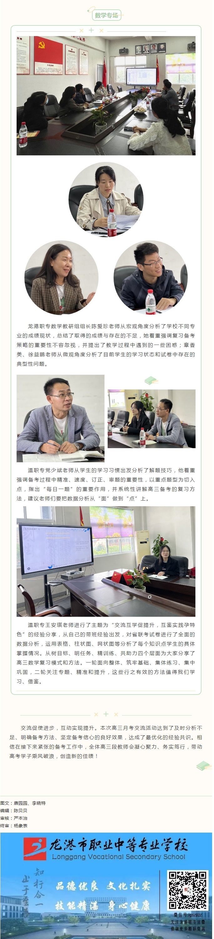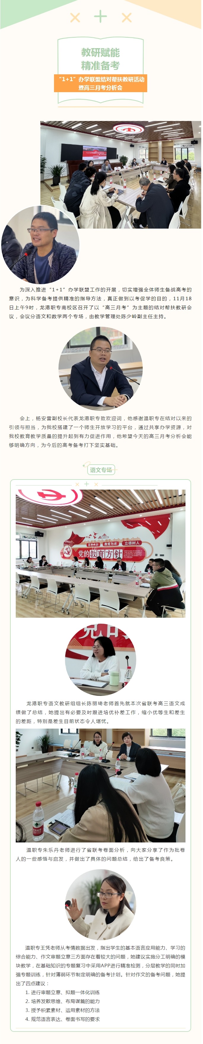 为深入推进“1+1”办学联盟工作的开展,切实增强全体师生备战高考的意识,为科学备考提供精准的指导方法,真正做到以考促学的目的,11月18日上午9时,龙港职专南校区召开了以“高三月考”为主题的结对帮扶教研会议,会议分语文和数学两个专场,由教学管理处陈少岭副主任主持。