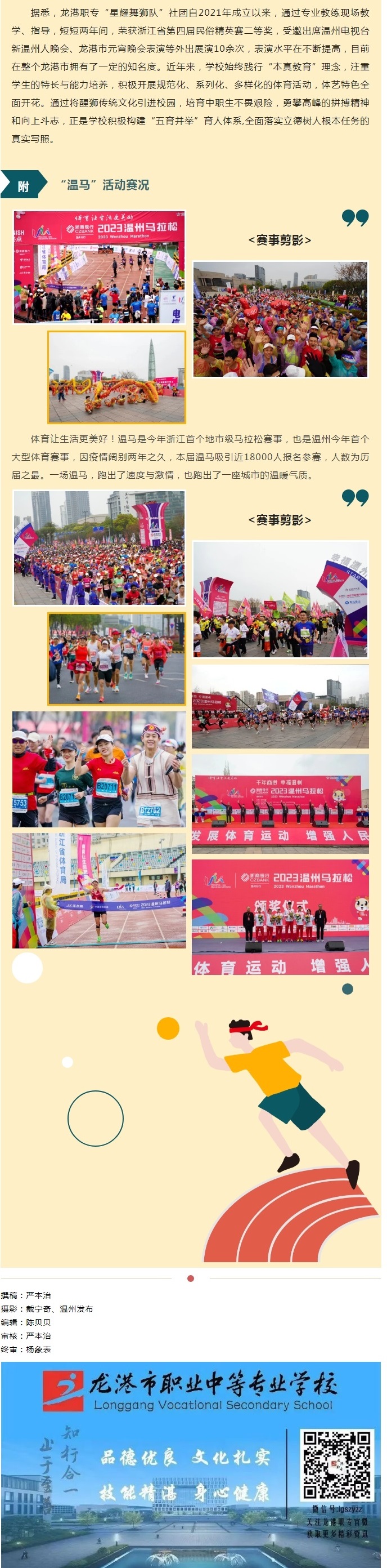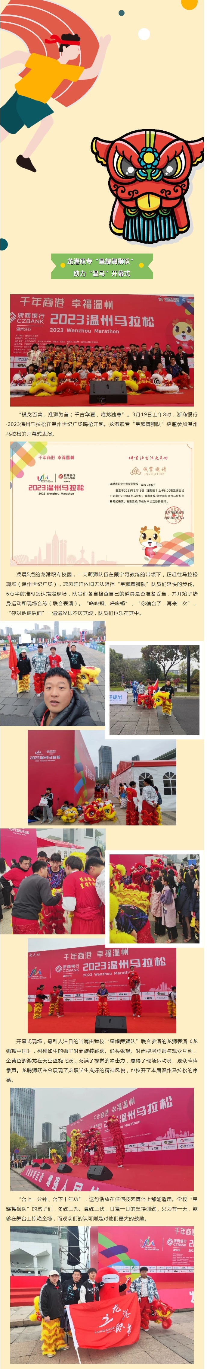 “横戈百兽,推狮为首;千古华夏,唯龙独尊”。3月19日上午8时,浙商银行·2023温州马拉松在温州世纪广场鸣枪开跑。龙港职专“星耀舞狮队”应邀参加温州马拉松的开幕式表演。